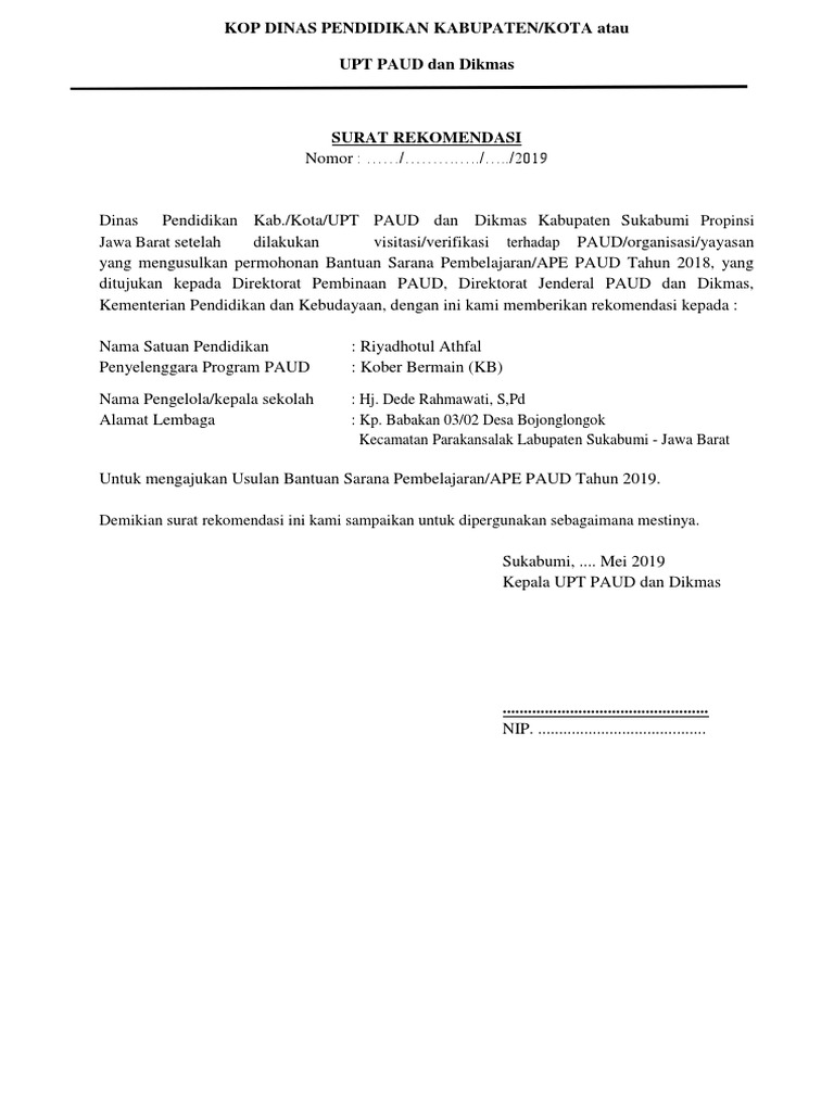 Contoh Surat Permohonan Bantuan Sarana Pembelajaran/APE PAUD Tahun …