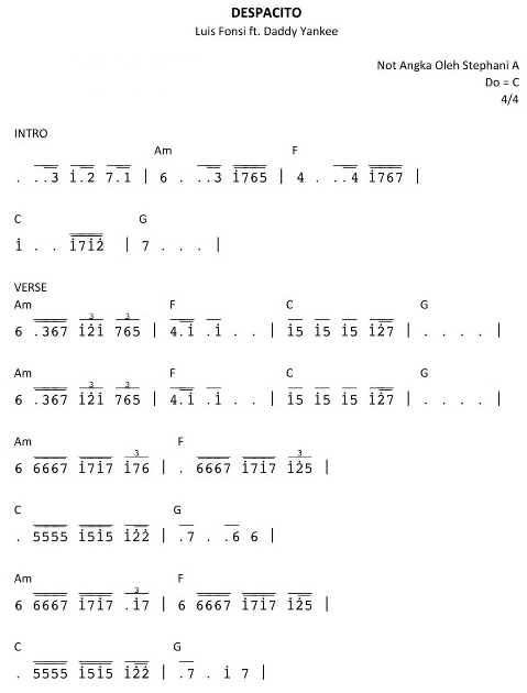 Not Angka dan Lirik Nyanyian Despacito Luis Fonsi ft Daddy Yankee Terbaru - Not Angka Lagu