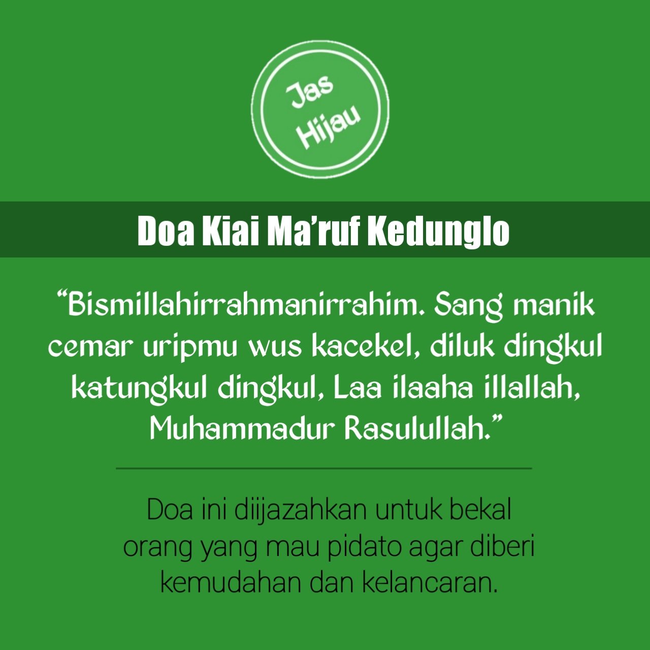 Jas Hijau on Twitter: ““Bismillahirrahmanirrahim. Sang manik cemar uripmu wus kacekel, diluk dingkul katungkul dingkul. Laa Ilaaha Illallah, Muhammadur Rasulullah.” Doa ini diijazahkan oleh Kiai Ma’ruf Kedunglo untuk bekal orang mau pidato