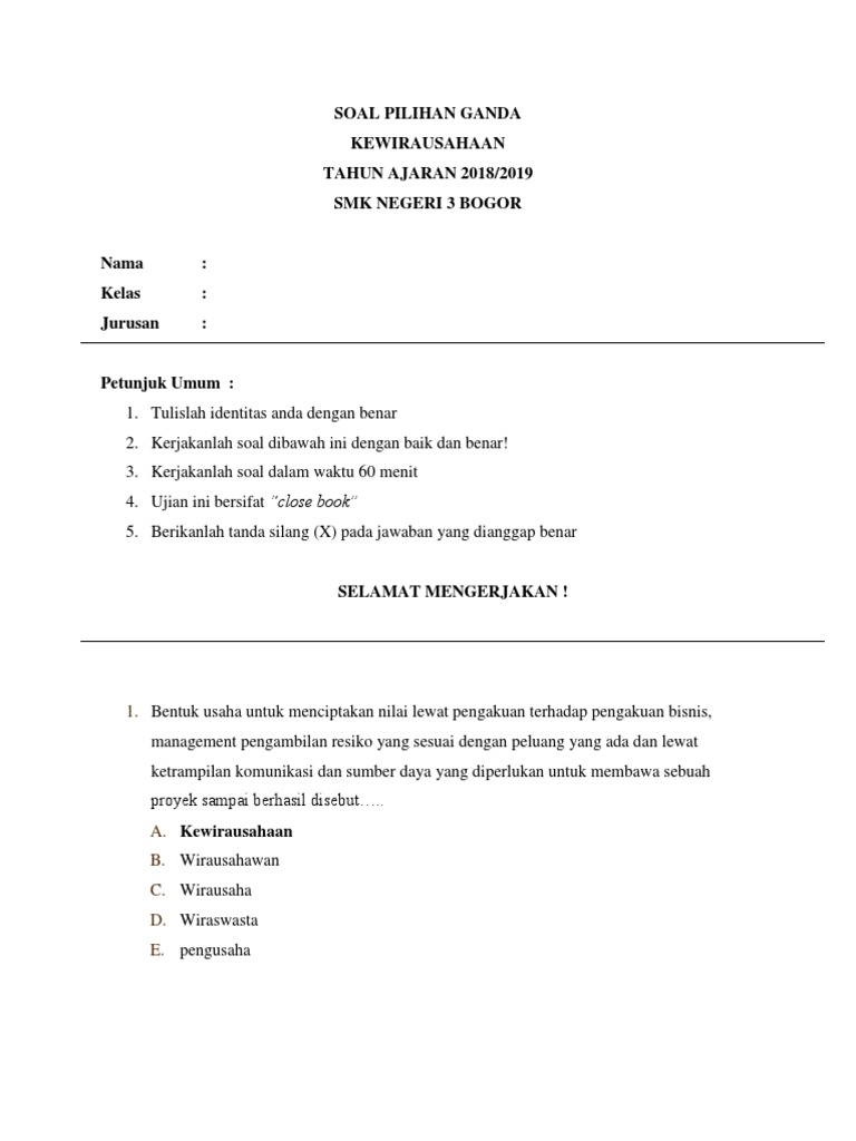 Soal Uts Kewirausahaan Kelas Xii Beserta Jawaban - Contohsoal.net