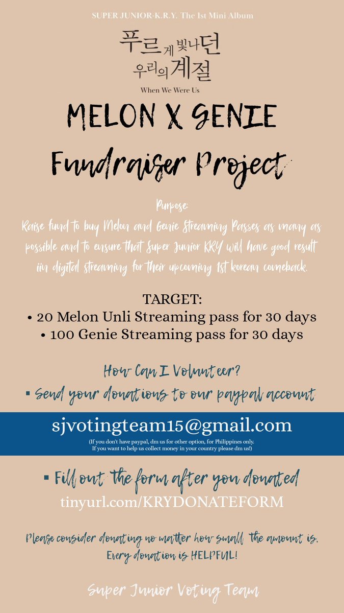 Super Junior Charts on Twitter: “Hello ELFs! we open donation drive again for @SJofficial KRY’s 1st korean comeback. All the money collected will be use to purchase some Melon and Genie streaming