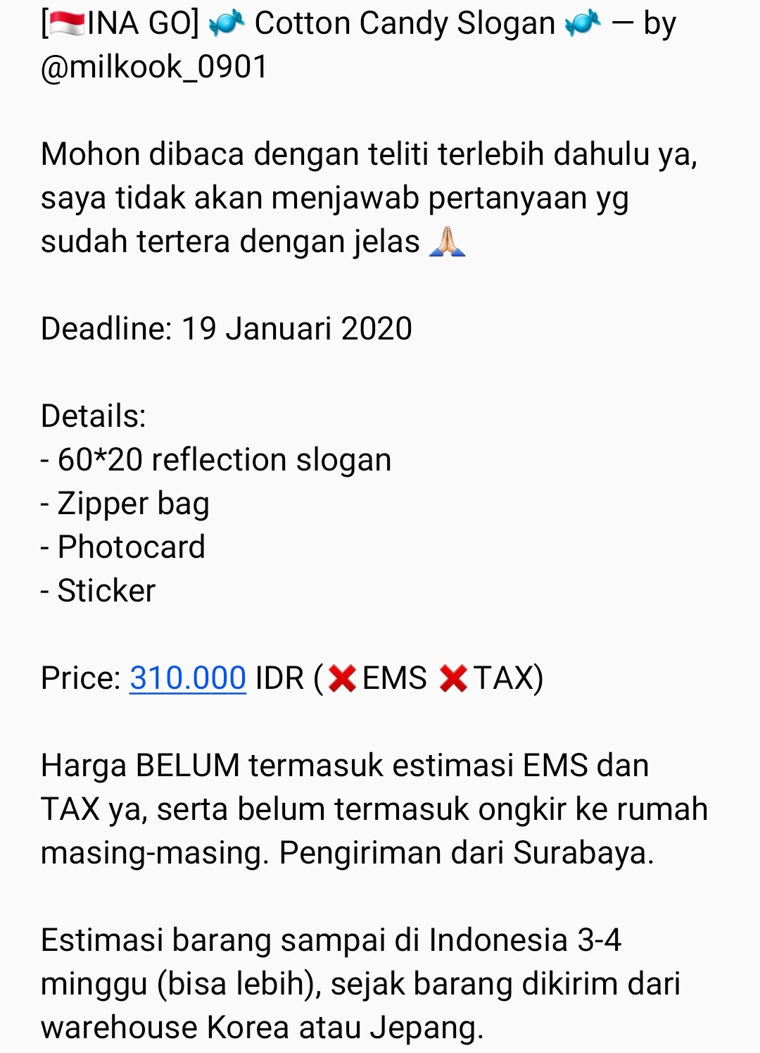 seugar (SLOWRESPON ) on Twitter: “[INA GO : EXTENDED DEADLINE] Cotton Candy Slogan — by @milkook_0901 Rp 310.000 (EMS TAX CICILAN) 29 Januari 2020 #JUNGKOOK #BTS https://t.co/6IuYWrTRFB”