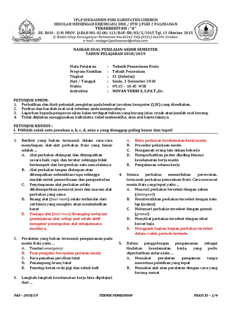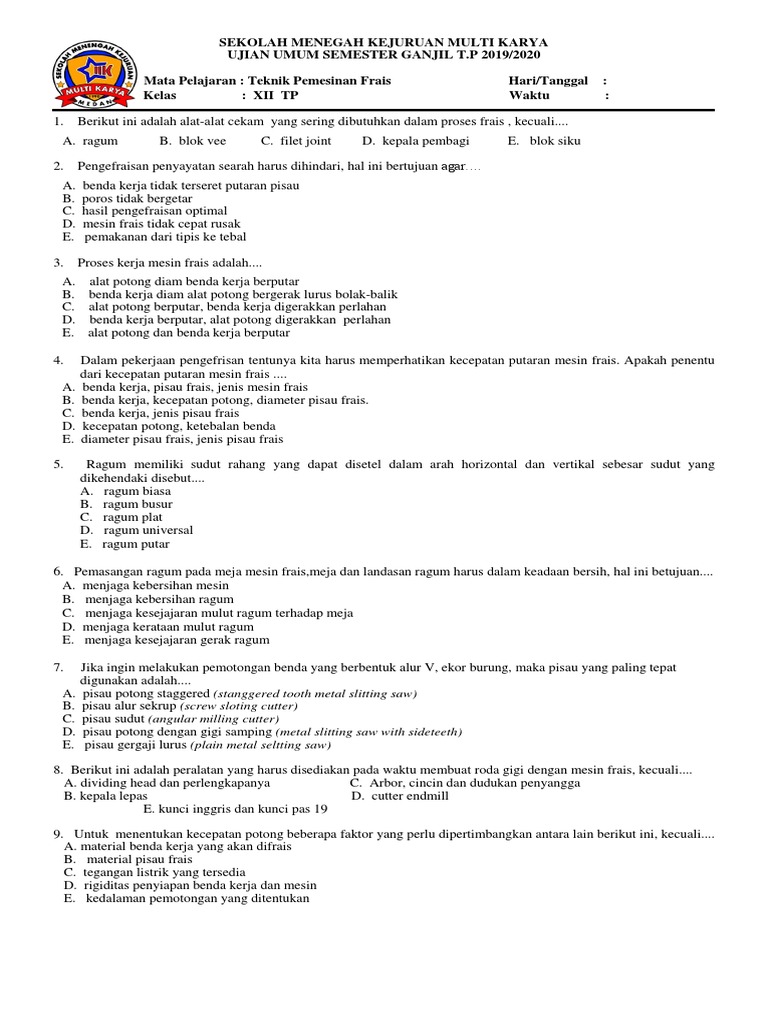 Soal Pilihan Ganda Mesin Frais Kls Xi Tp - PDF Free Download