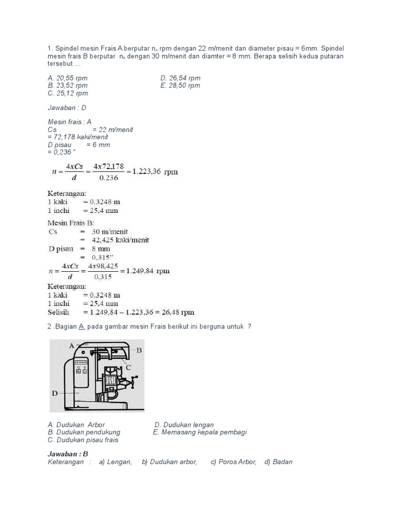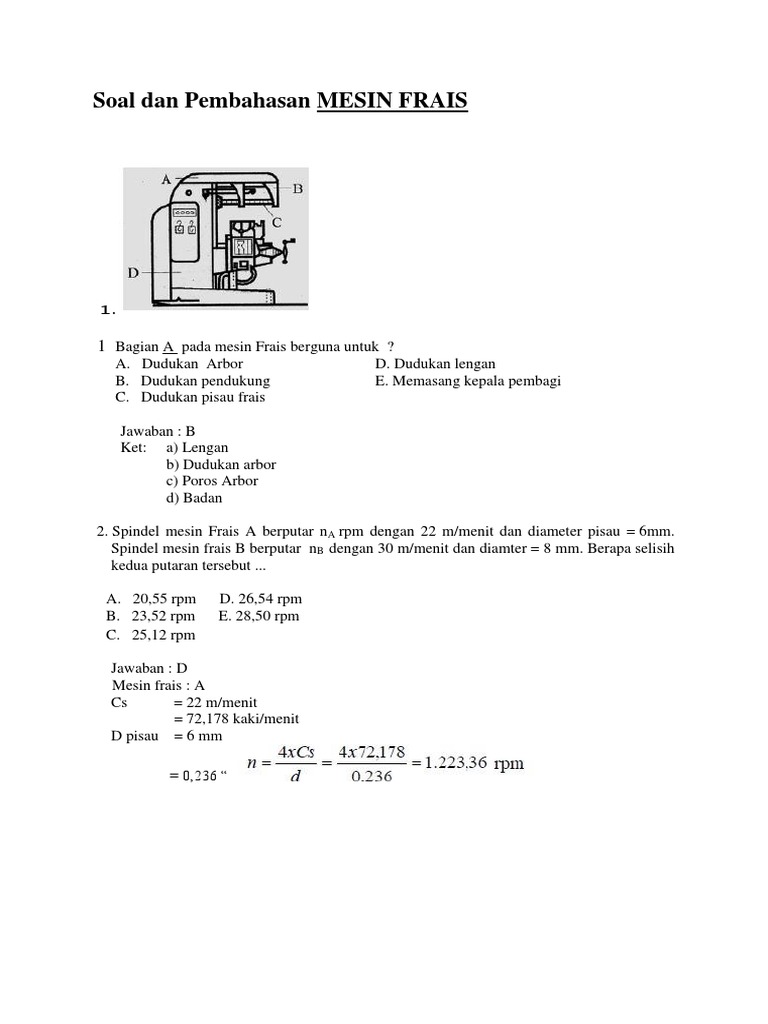 Soal dan Pembahasan FRAIS.docx - Soal dan Pembahasan MESIN FRAIS 1 Bagian A pada mesin Frais berguna untuk A Dudukan Arbor D Dudukan lengan B Dudukan | Course Hero