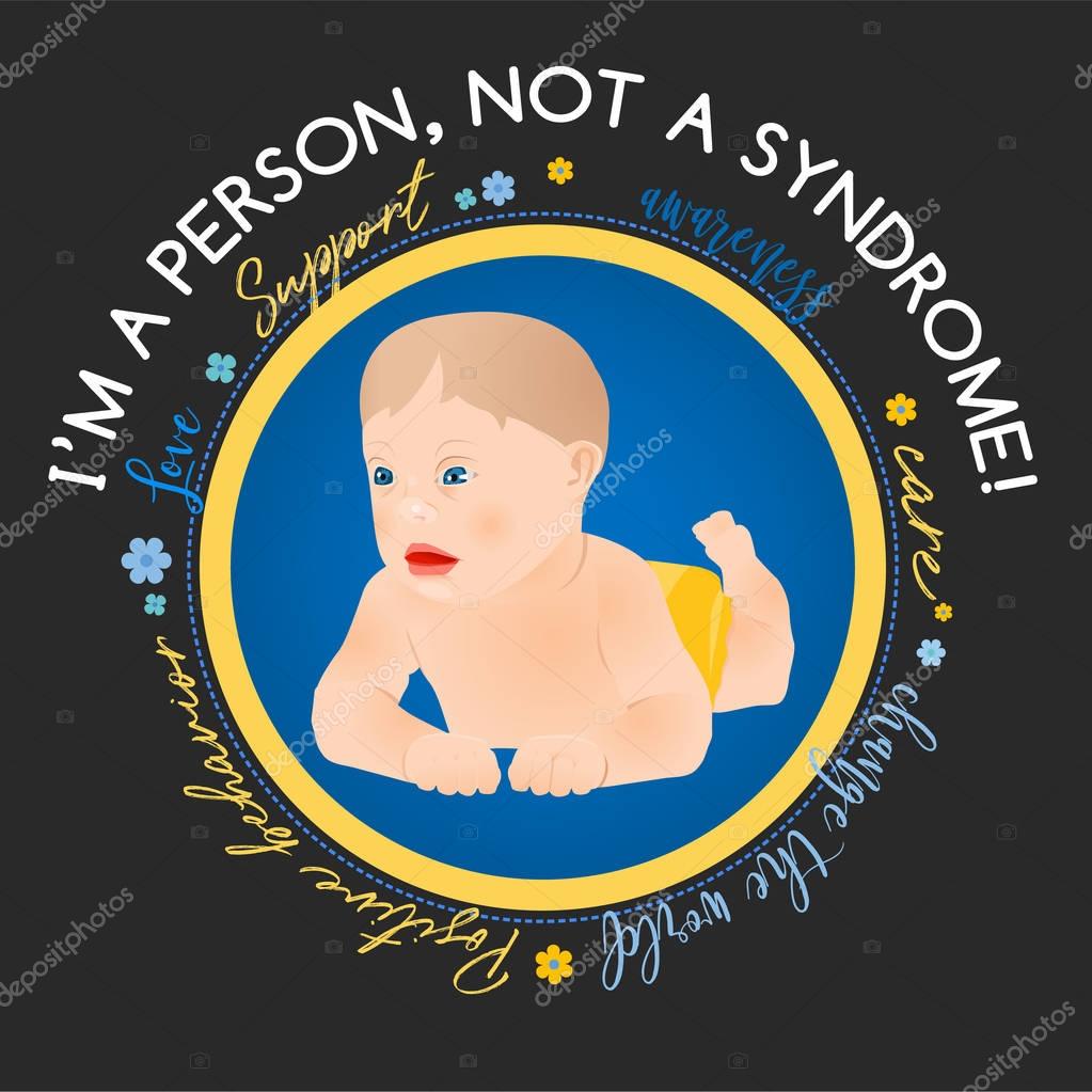 World down syndrome awareness day poster. I am a person, not a syndrome. Vector illustration in blue, yellow and white colours with a little boy image on a dark grey background.
