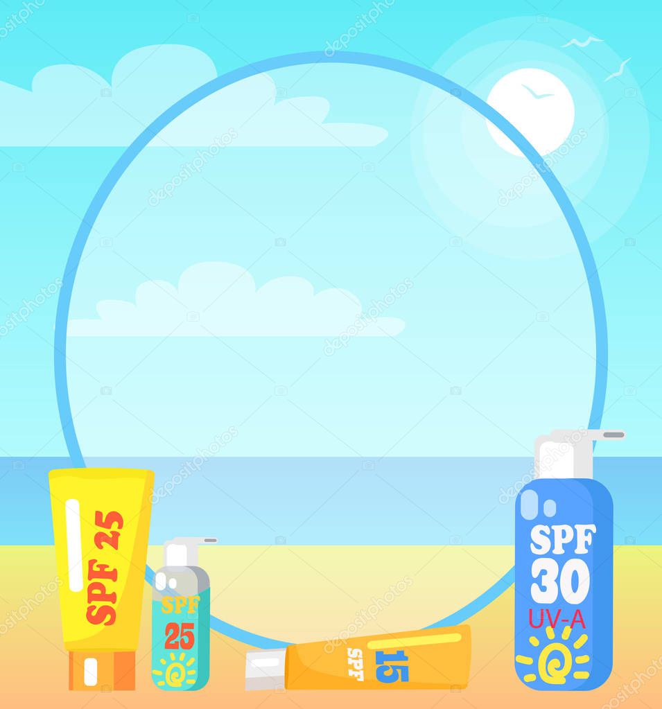 Poster showing peaceful seaside. Vector illustration of various spf suncreen lotions against background of sand, calm sea and blue sky premium vector in Adobe Illustrator ai ( .ai ) format, Encapsulated