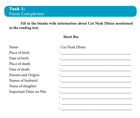 Kunci Jawaban Bahasa Inggris Chapter 11, Task 1, Halaman 145-147, Cut Nyak Dhien - Saifullah.id