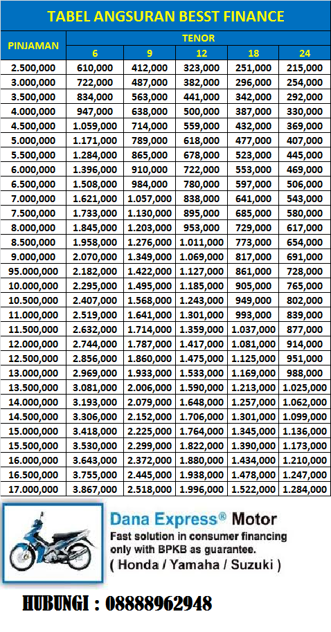 Terjual TABEL ANGSURAN KREDIT DANA TUNAI JAMINAN BPKB MOTOR DAN MOBIL. TERBARU | KASKUS