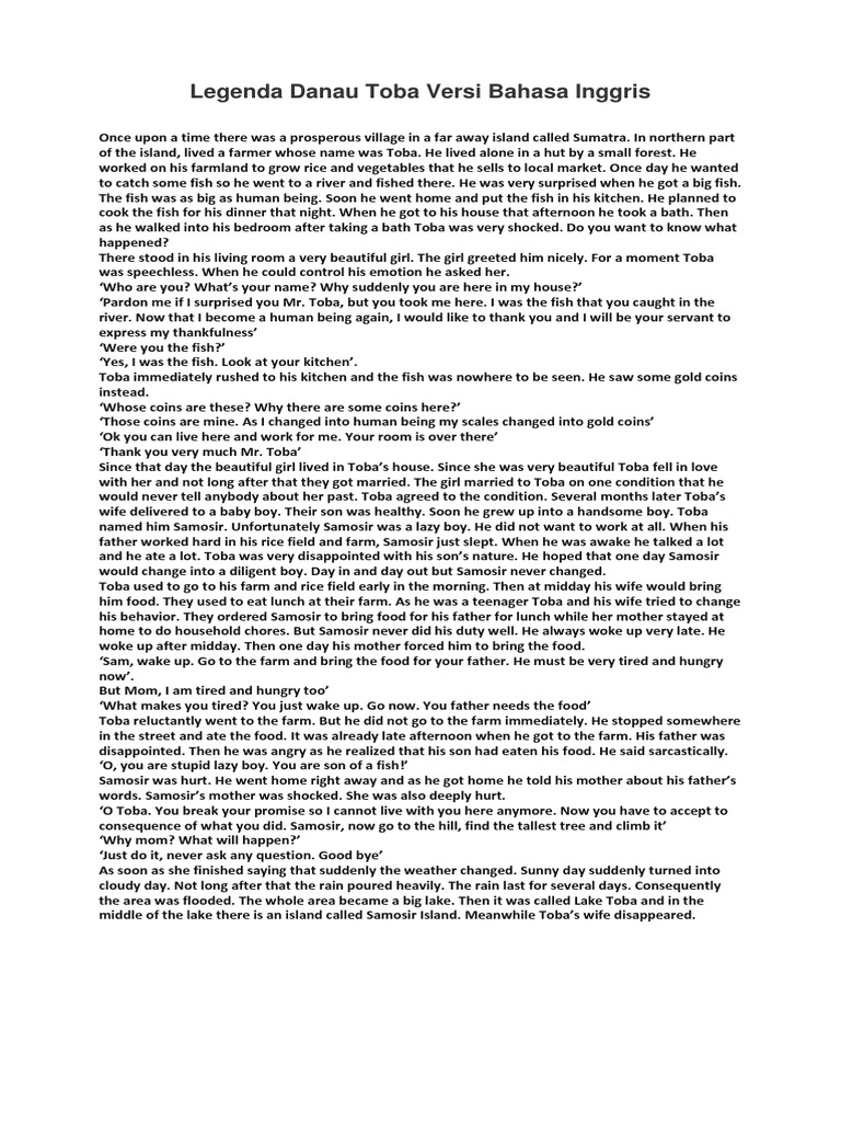 Cerita Asal Usul Danau Toba Singkat Dalam Bahasa Inggris