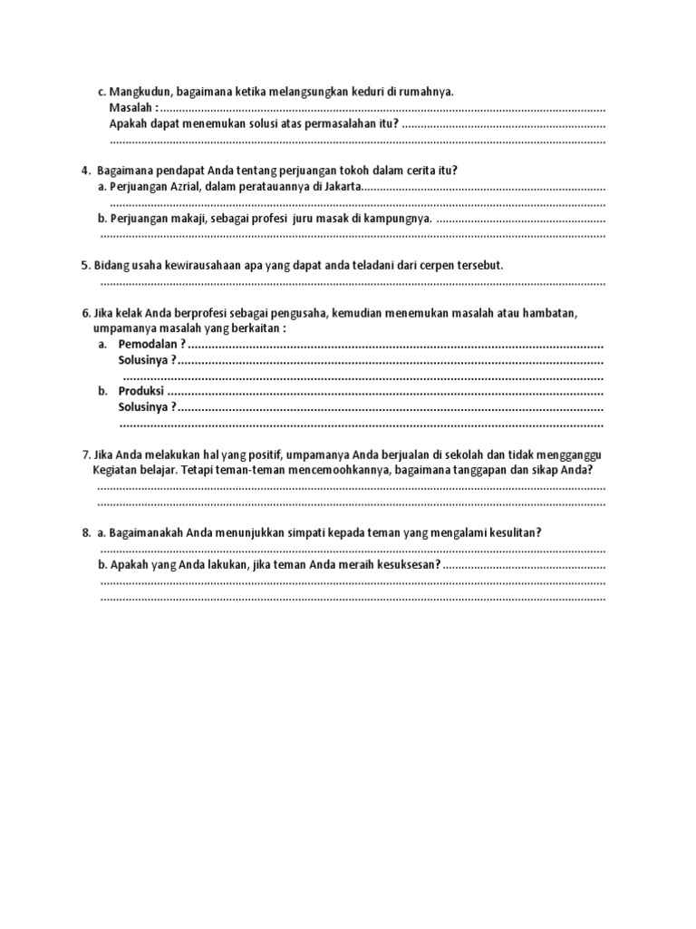 Pertanyaan dari Cerpen Juru Masak Bahasa Indonesia Semester I Kurikul…