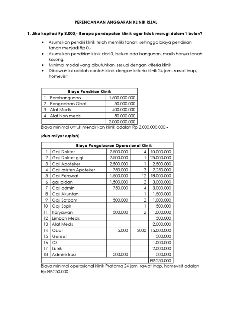 363383336-Perencanaan-Anggaran-Klinik-by-Rijal.docx - PERENCANAAN ANGGARAN KLINIK RIJAL 1 Jika kapitasi Rp 8.000 Berapa pendapatan klinik agar tidak | Course Hero