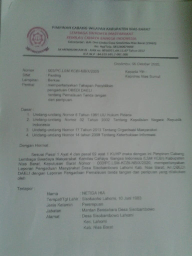 Ketua Cabang LSM KCBI Desak Kapolres Nias Terkait Kasus Pemalsuan Tanda Tangan Obedi Daeli Jangan Jalan di Tempat | POLICEWATCH.NEWS