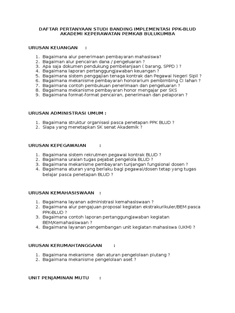Daftar Pertanyaan Studi Banding Implementasi Ppk