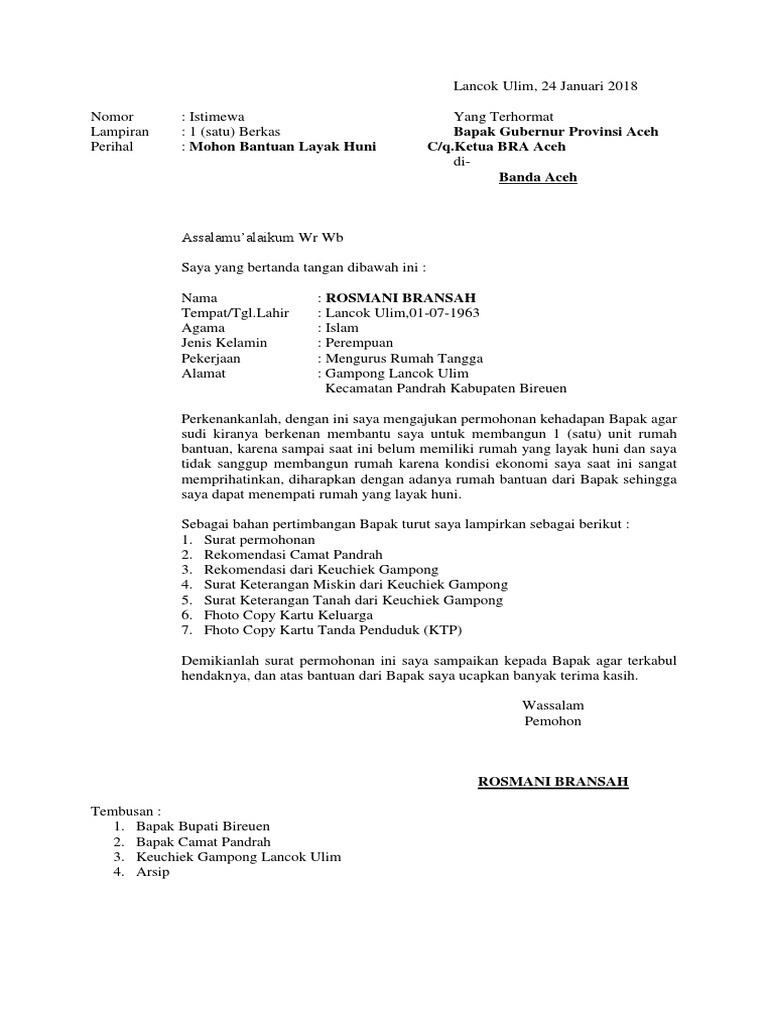 Contoh Surat Permohonan Bantuan Rumah Tidak Layak Huni - Contoh Seputar Surat