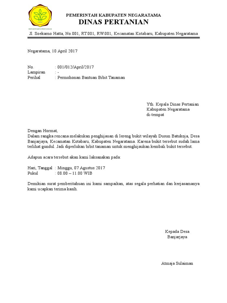 Contoh Surat Permohonan Bantuan Bibit Tanaman - Contoh Seputar Surat