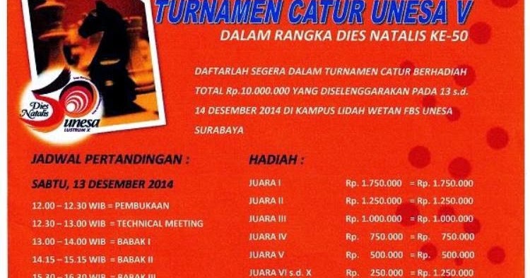 Informasi Brosur Turnamen Catur Since 2009: TURNAMEN CATUR DIES NATALIS 50 UNESA, SURABAYA, OPEN NON MASTER, CEPAT, 13-14 DESEMBER 2014, Hadiah Total Rp.10Jt