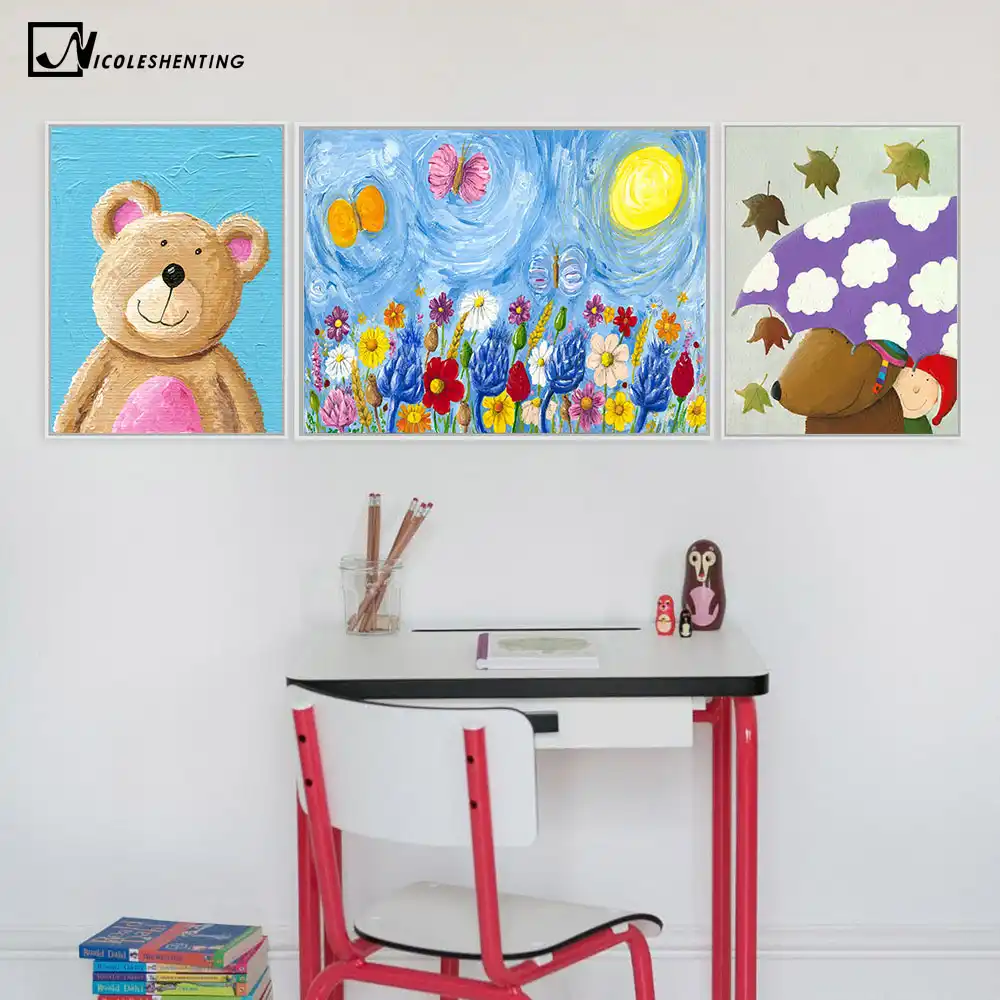 Anak Poster Kartun Hewan Beruang Kelinci Art Kanvas Lukisan …