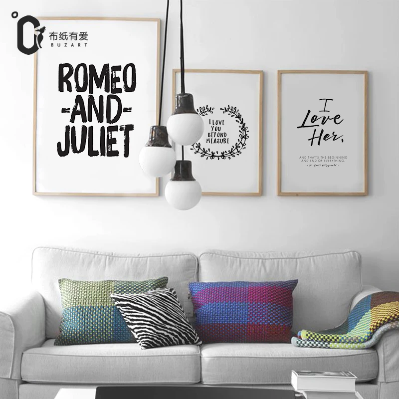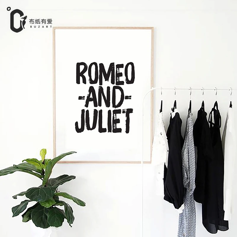 Romeo dan Juliet Cetakan cetakan Hitam dan putih poster Tipografi untuk hiasan rumah ruang tamu Tiada Frame