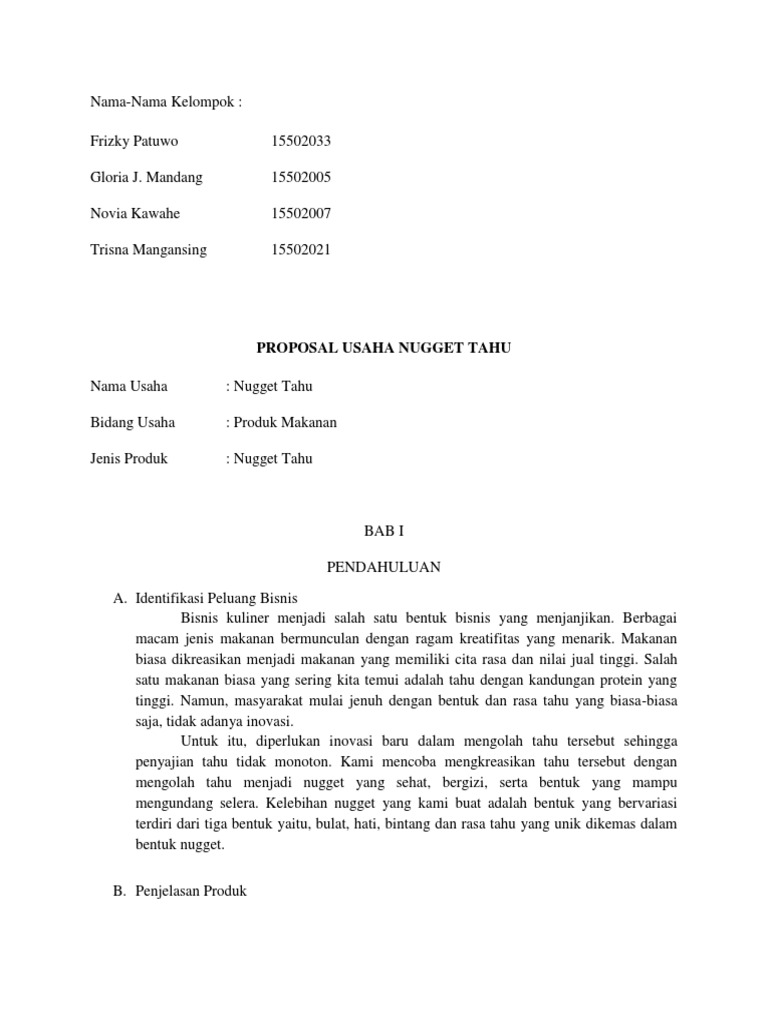 Makalah KWU.docx - PROPOSAL USAHA BISNIS NUGGET TAHU Disususn oleh Golongan AC3 Damayanti Prasetyani 1625010138 Jolang Tejo Pamungkas 1625010139 Vivas | Course Hero