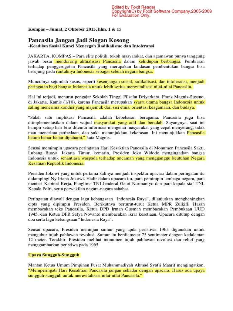 Pancasila Jangan Jadi Slogan Kosong: Kompas – Jumat, 2 Oktober 2015, hlm. 1 & 15
