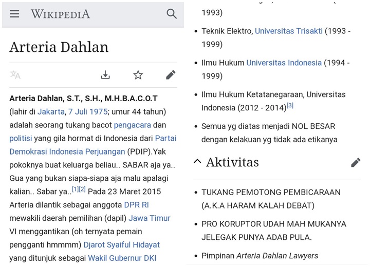 Biodata Arteria Dahlan Diubah Netizen, Wikipedia Justru Malah Alami Kerugian - PojokSumut.com