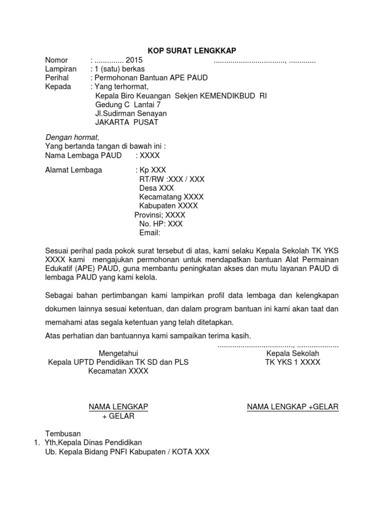 Contoh Surat Permohonan Bantuan Sarana Pembelajaran/APE PAUD Tahun 2018 - FORMAT-FILE