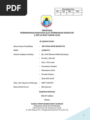 Proposal Permohonan Bantuan Alat Permainan Edukatif ( Ape ) Paud Tahun 2018