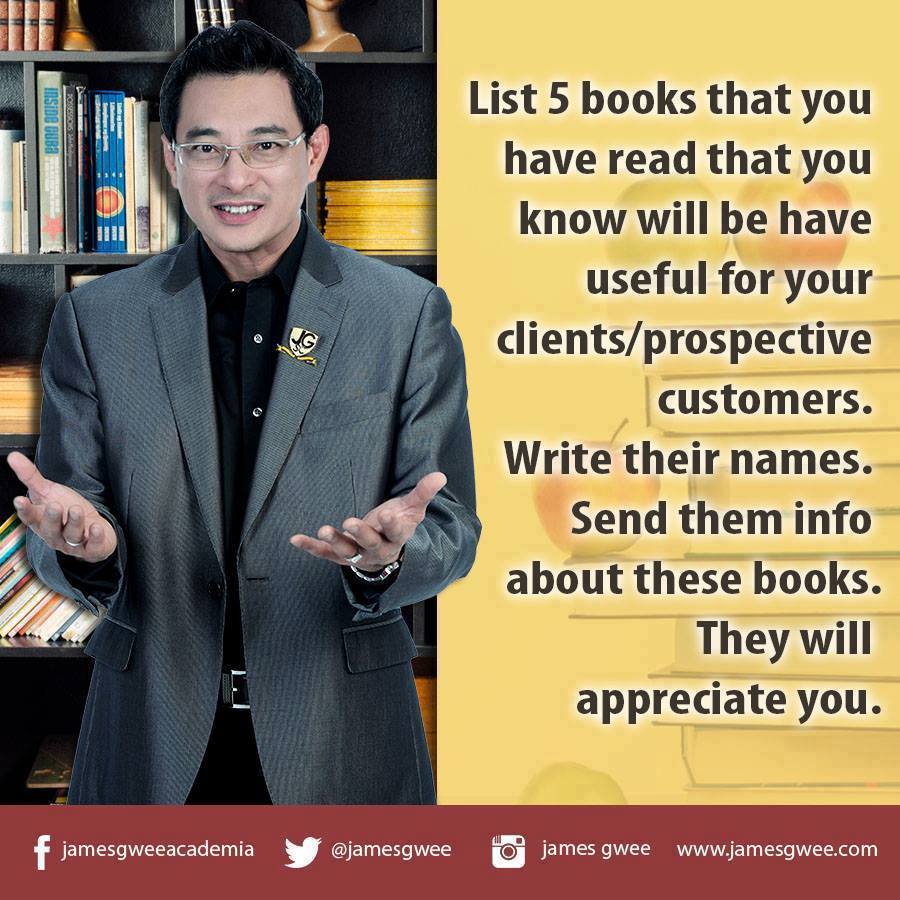 James Gwee Twitterren: “Tulislah 5 buku yang telah Anda baca yang Anda tahu akan bermanfaat bagi klien / calon pelanggan Anda. Tuliskan nama mereka Kirimkan info tentang buku-buku ini. Mereka akan menghargai