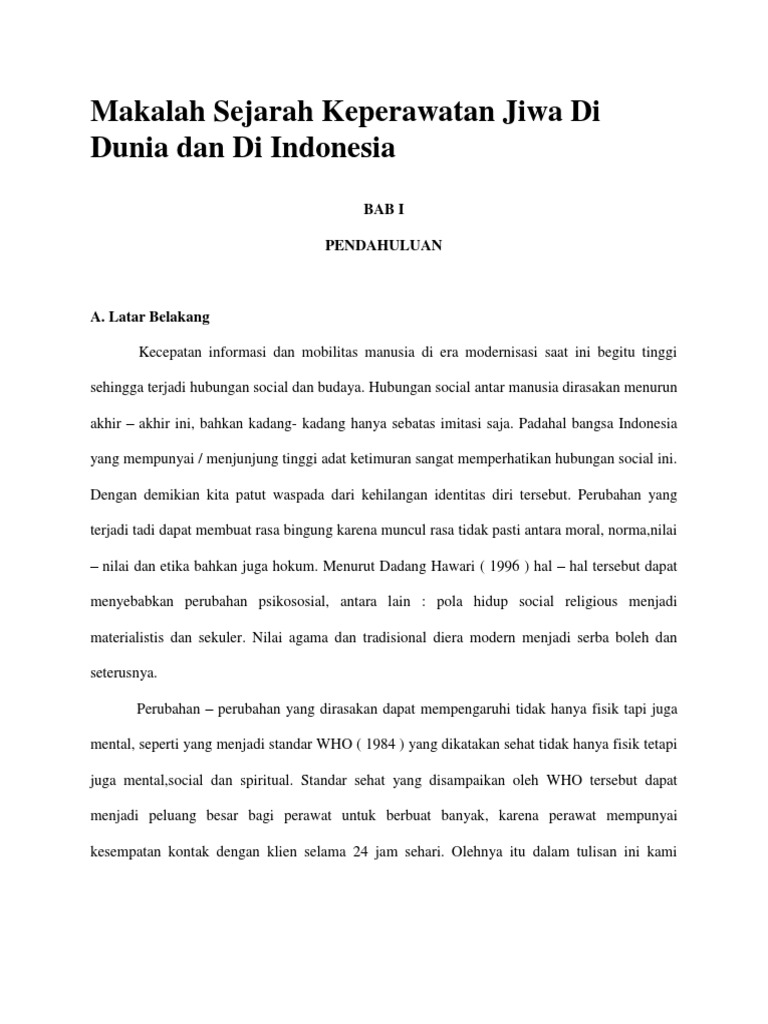 Makalah Sejarah Keperawatan Jiwa Di Dunia dan Di Indonesia: Bab I Pendahuluan