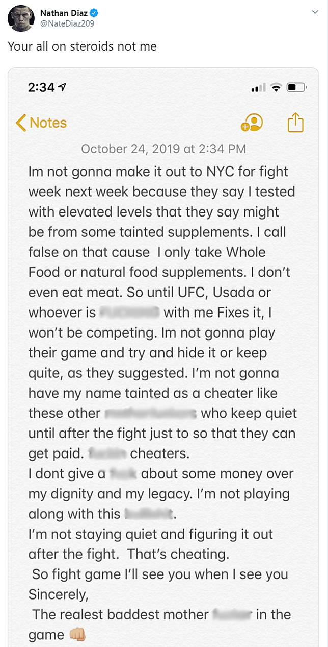 UFC 244: Nate Diaz says he’s out of Jorge Masvidal fight because of ‘tainted supplements’ in angry Twitter post