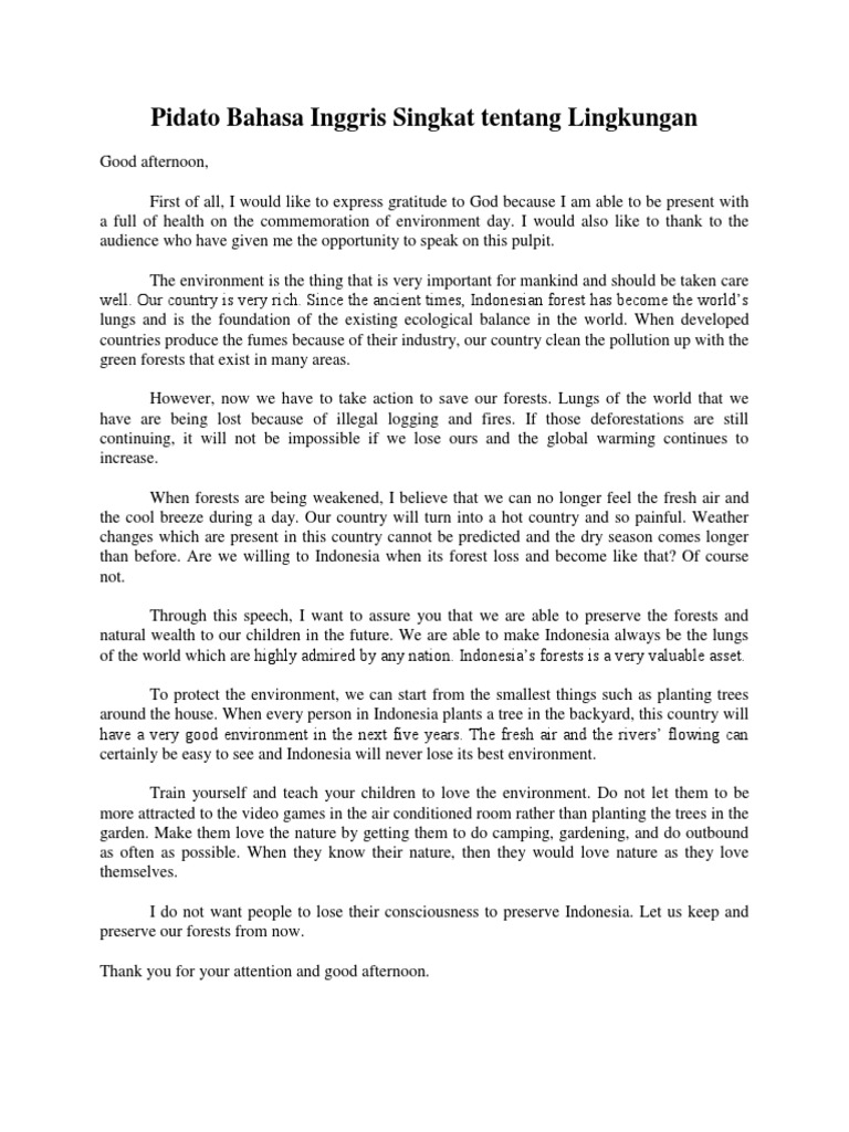Pidato Bahasa Inggris Singkat Tentang Lingkungan