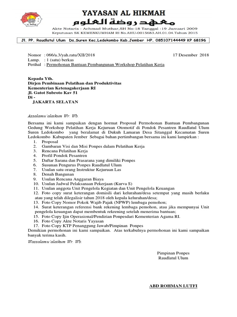 PDF) CONTOH PROPOSAL PERMOHONAN DANA PEMBANGUNAN ASRAMA PONDOK PESANTREN | MTs Swasta Al-Khoir Mananti - Academia.edu