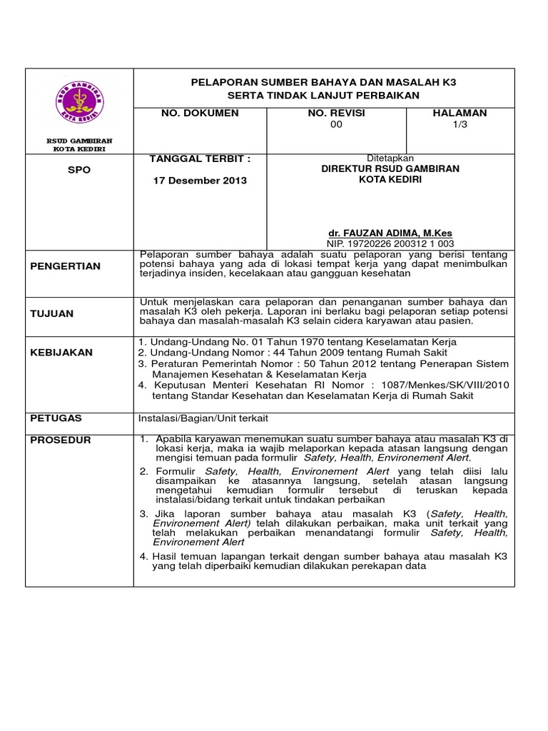 Spo Pelaporan Sumber Bahaya K3 Dan Tindak Lanjut Perbaikan …