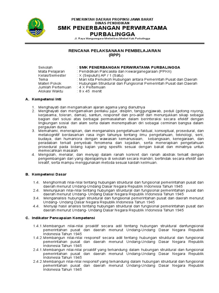 RPP PKn kelas X tentang Hubungan struktural dan fungsional pemerintahan pusat dan daerah menurut UUD Negara Republik Indonesia Tahun 1945 | Kumpulan Tugas Kuliah
