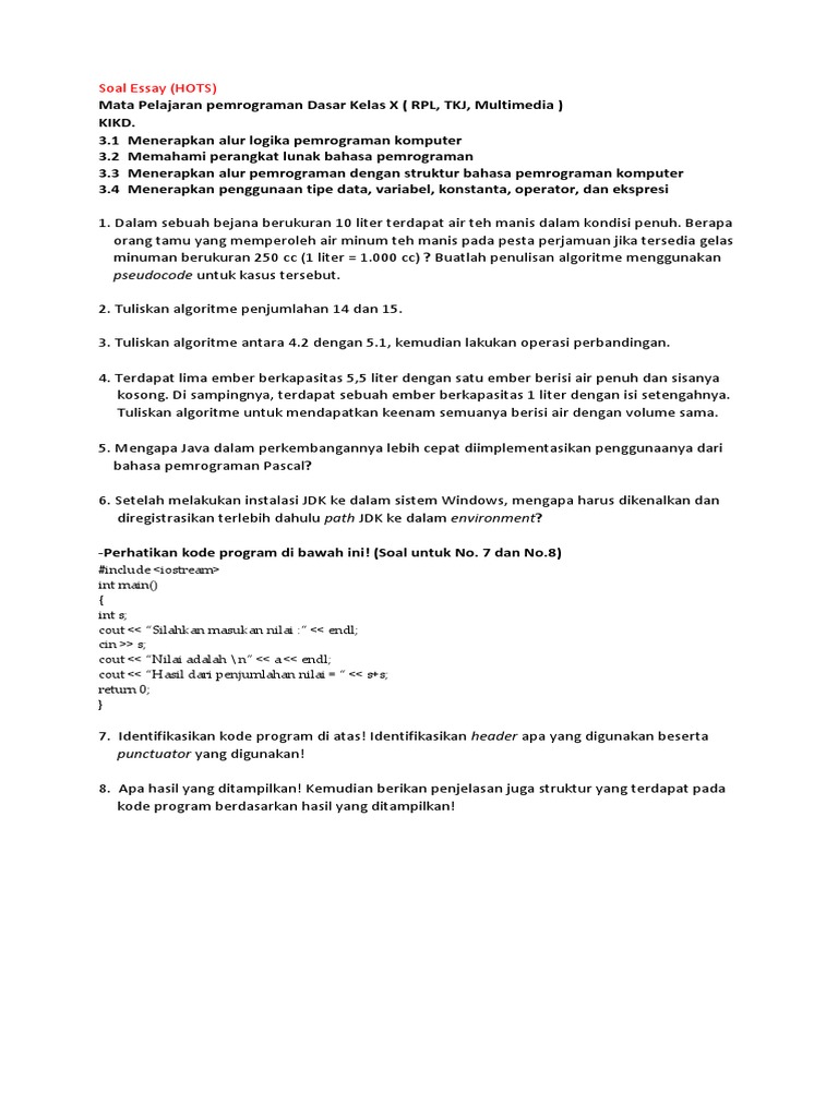 Contoh Soal Essay Pemrograman Dasar Dan Jawabannya Kelas 10 Contoh …