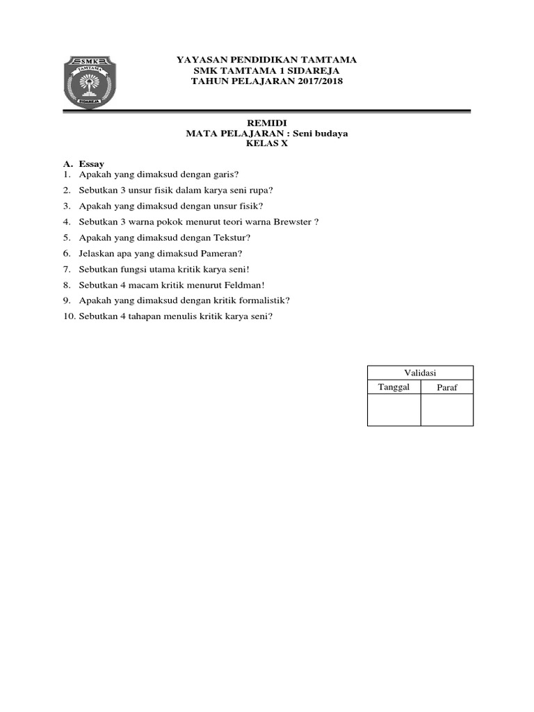 Soal Seni Budaya Pts Smk Al Washliyah Kelas x Tkj & Tsm