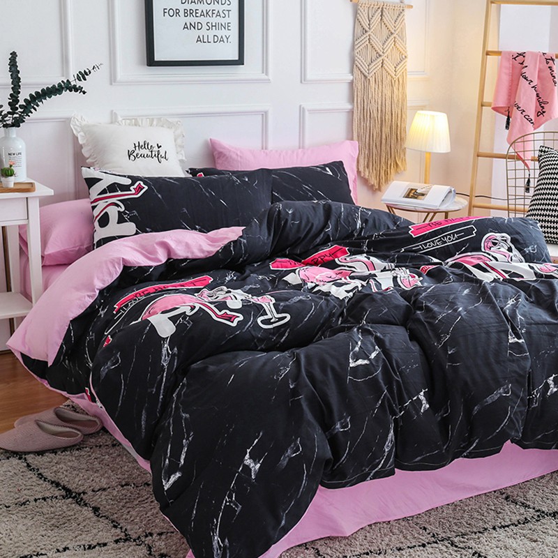 100% washed polyester Black pink flamingo duvet cover set soft …