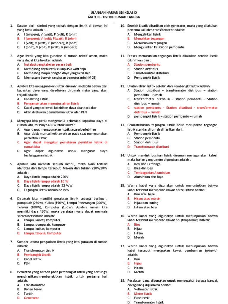 ULANGAN HARIAN SBI KELAS IX MATERI – LISTRIK RUMAH