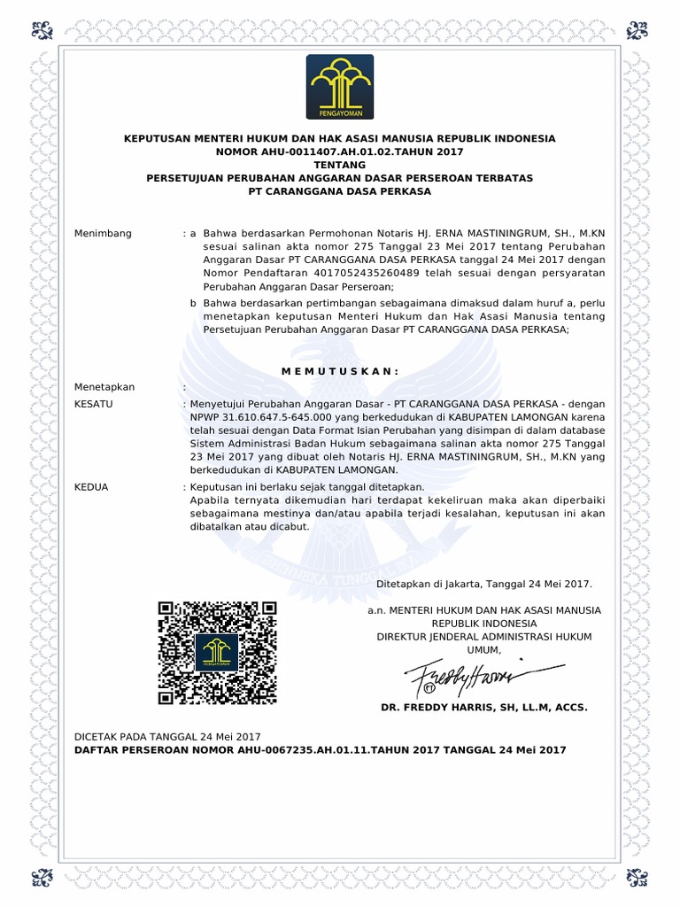 Sk menkumham ri persetujuan akta perubahan anggaran dasar pt. helori …