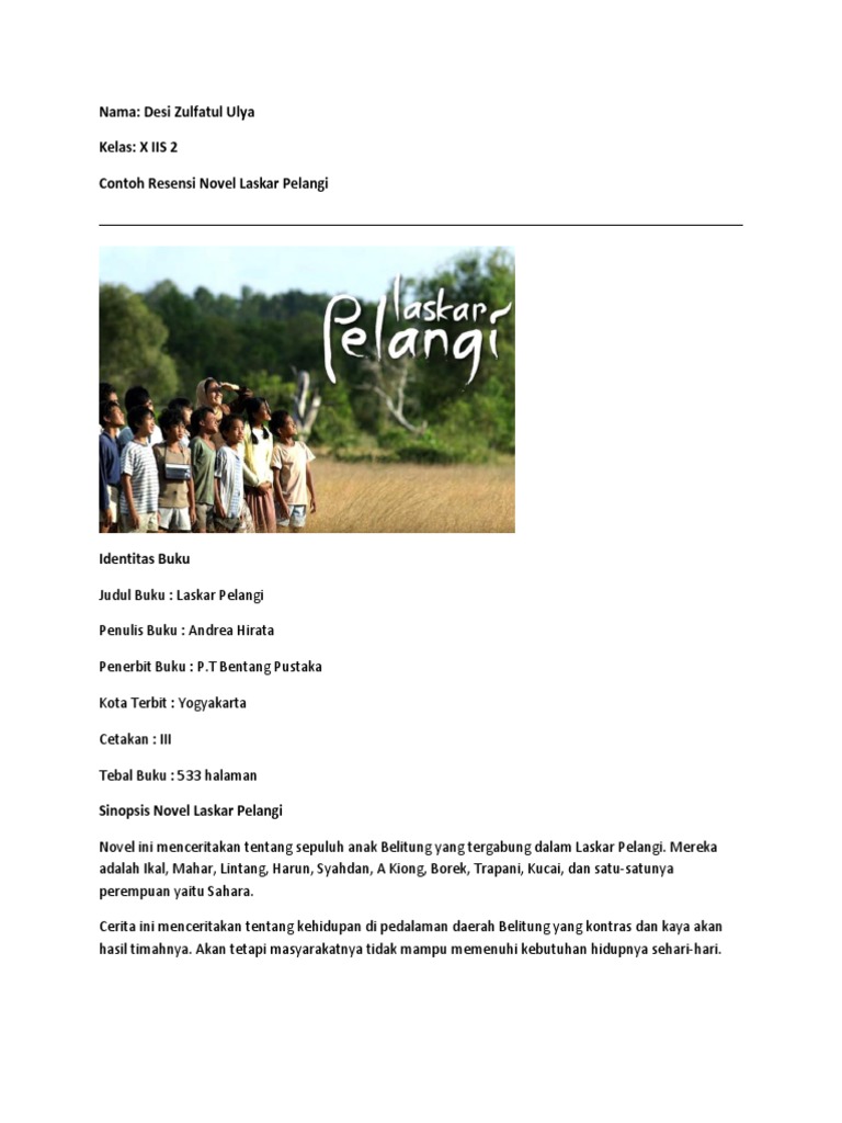DOC) Contoh Resensi Novel Laskar Pelangi Sinopsis Novel Laskar Pelangi Novel ini menceritakan tentang sepuluh anak Belitung yang tergabung dalam Laskar | Annissa Ari Mukti - Academia.edu