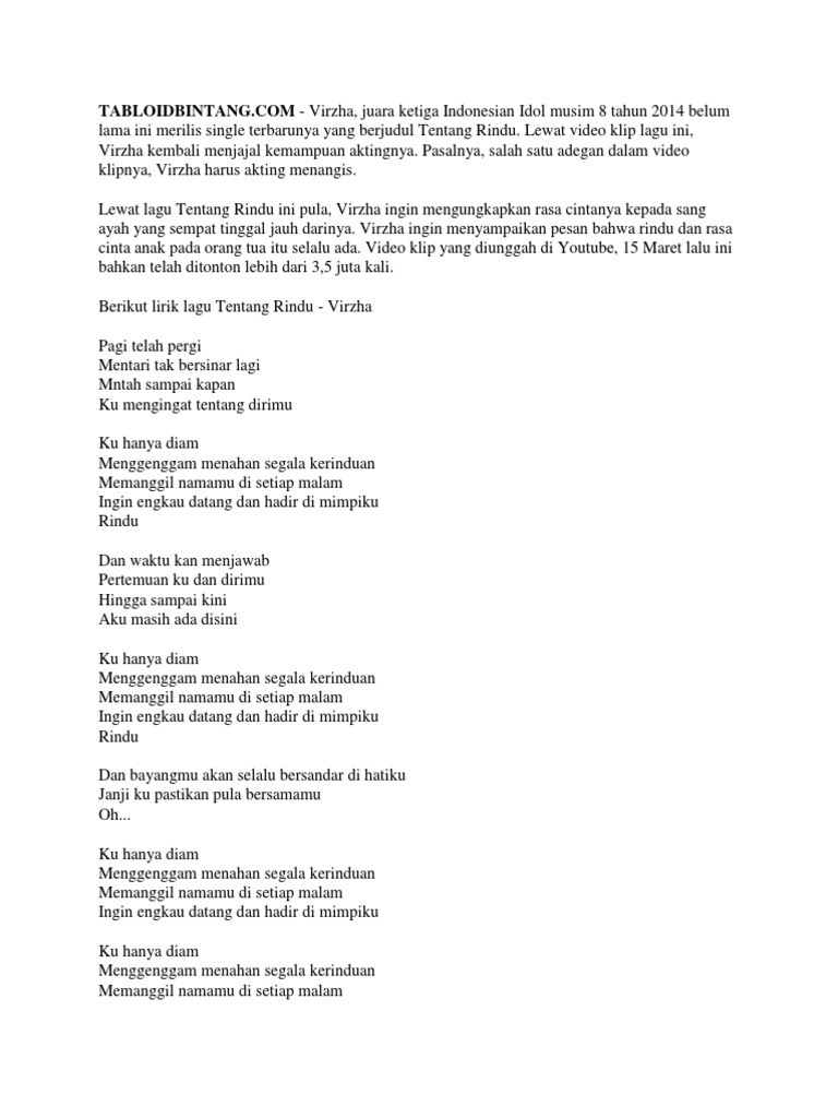 Download Lagu Tentang Rindu dari Virzha Tonton Video YouTube dan Lirik - Halaman 2 - Tribun Padang