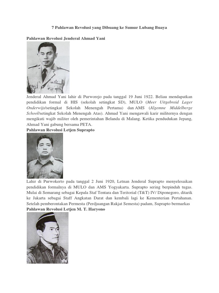 7 Pahlawan Revolusi Yang Dibuang Ke Sumur Lubang Buaya