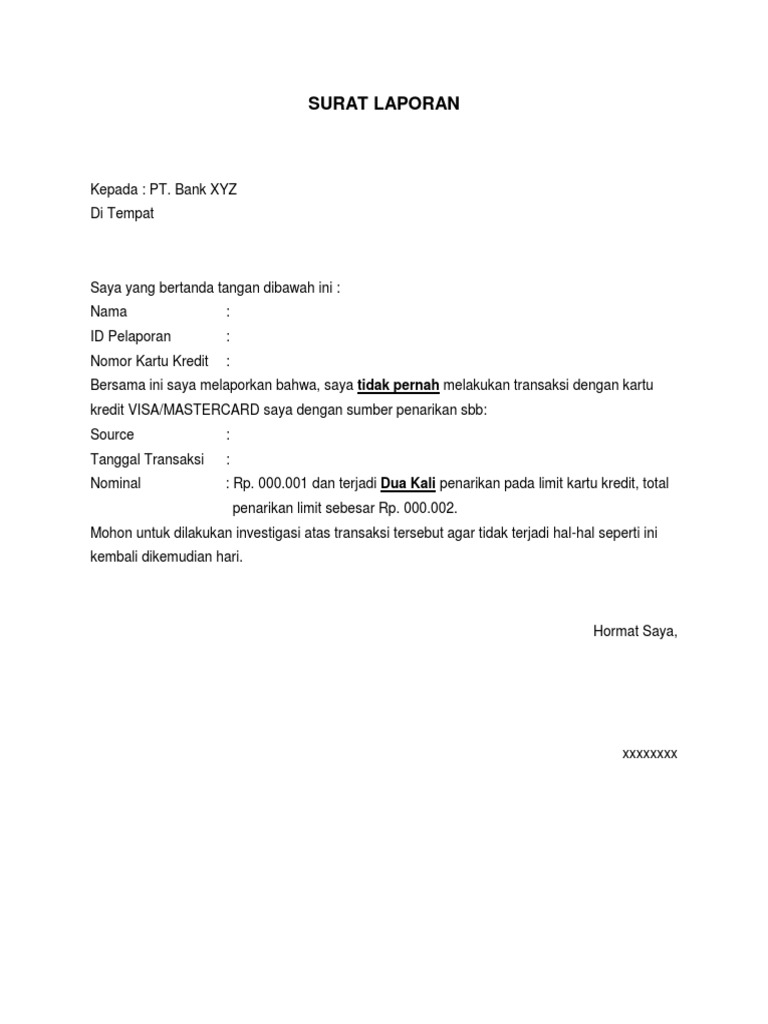 Contoh Surat Laporan tidak transaksi kartu kredit