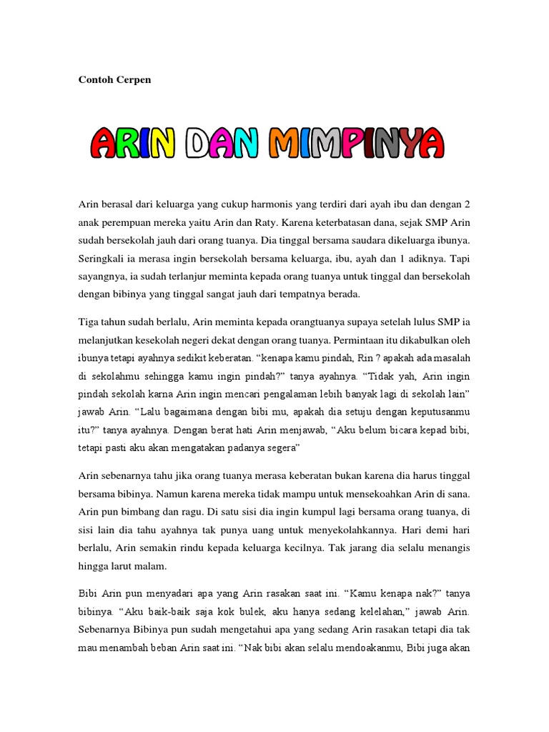 Arin dan Mimpinya.docx - NAMA PINKANSIA NGGAJA KELAS IX C TUGAS BAHASA INDONESIA Cerpen Arin dan Mimpinya Arin berasal dari keluarga yang cukup harmonis | Course Hero