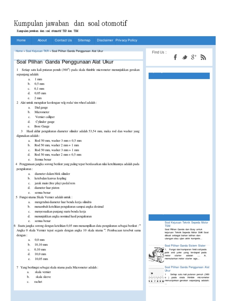 Soal Pilihan Ganda Penggunaan Alat Ukur | Kumpulan jawaban dan soal otomotif