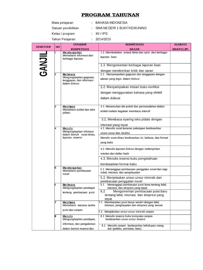 Program Tahunan: Semester NO Standar Kompetensi Kompetensi Dasar Alokasi Waktu (Jp) 1 Mendengarkan