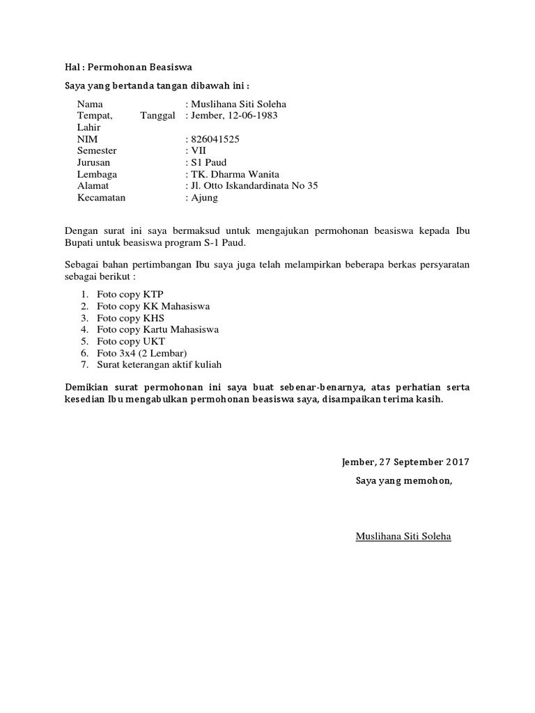 Cara Memuat Surat: Contoh Surat Permohonan Beasiswa Kepada Bupati Jember