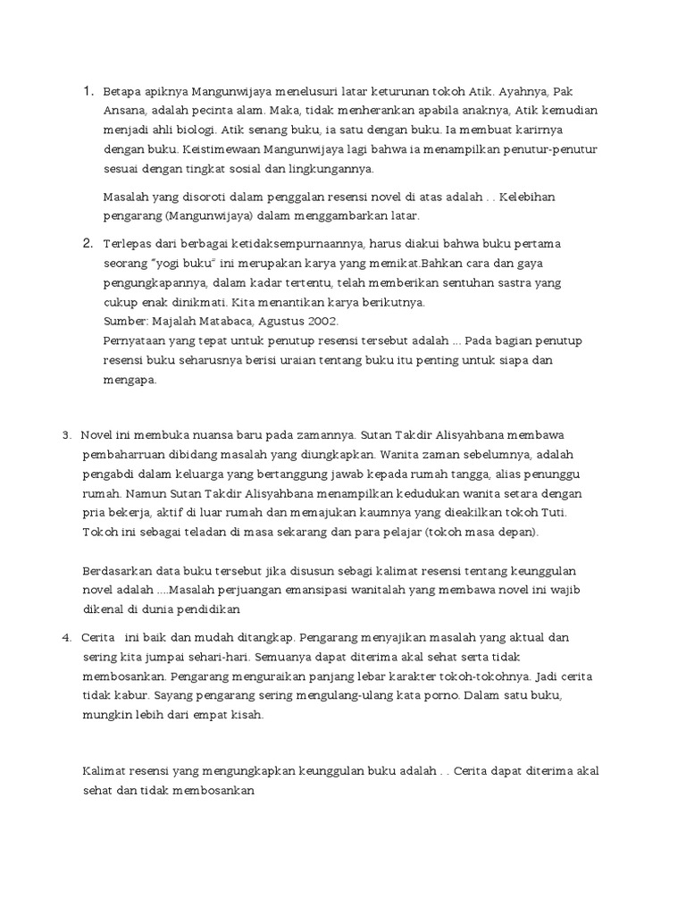 Soal Bahasa Indonesia tentang resensi novel beserta kunci jawabannya