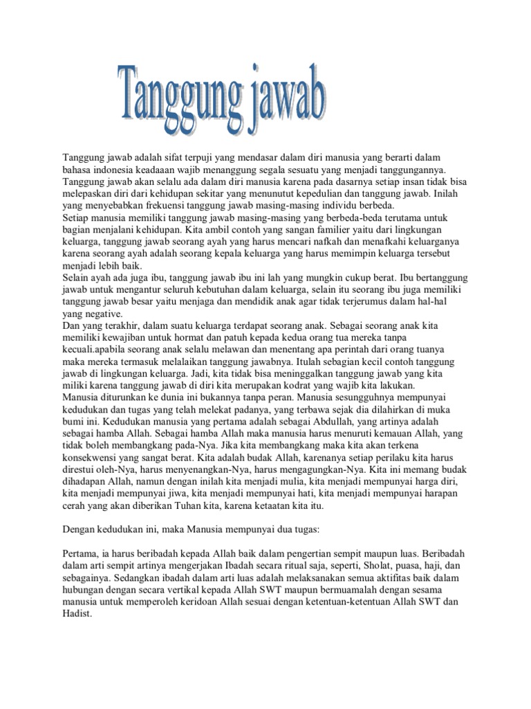 Tanggung Jawab Adalah Sifat Terpuji Yang Mendasar Dalam Diri Manusia Yang Berarti Dalam Bahasa Indonesia Keadaaan Wajib Menanggung Segala Sesuatu Yang Menjadi Tanggungannya