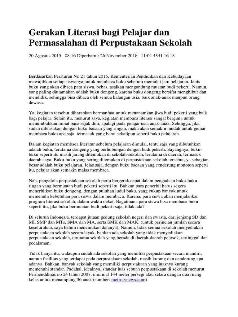 Gerakan Literasi Bagi Pelajar Dan Permasalahan Di Perpustakaan Sekolah